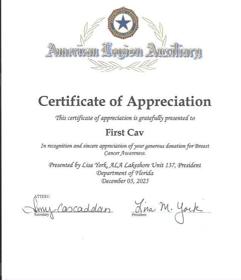 January 20, 2026 We had a joint visit with the Ormond Beach VVA group, meeting half-way in St. Augustine FL. And some were Cav vets who met their foxhole buddies for the first time. Our VP, Sam Berninger, has been recognized as having never missed 66 meetings. Others have come close but only one has a 5 star rating. We received a recognition from the American Legion Auxiliary for our support of their breast cancer awareness programs. Now, for 2026, if you live in a zip code that starts 32xxxx, just respond to this Chapter Letter and we’ll save a seat for you. And the chow is better than C rats, MRE’s or what ever bag they are serving now.